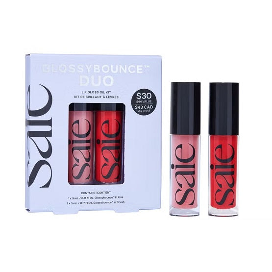 Give the gift of dewy, plump lips with Saie's Glossybounce Duo which features two full-size lip oils in the iconic shade 'Kiss' and limited edition shade 'Crush'.