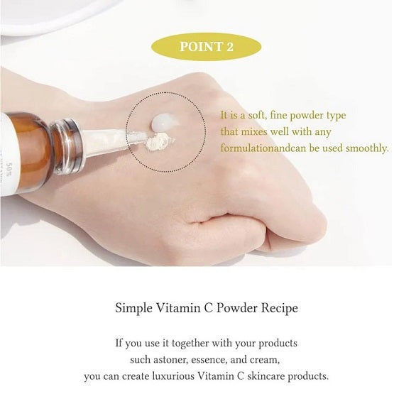 Pure Vitamin C 50% Boosting Powder is a highly concentrated powder type of fine particles that stabilizes vitamin C in the freshest state. It is absorbed immediately without residual or white cast and increased the absorption rate through British vitamin C rather than synthetic vitamins.